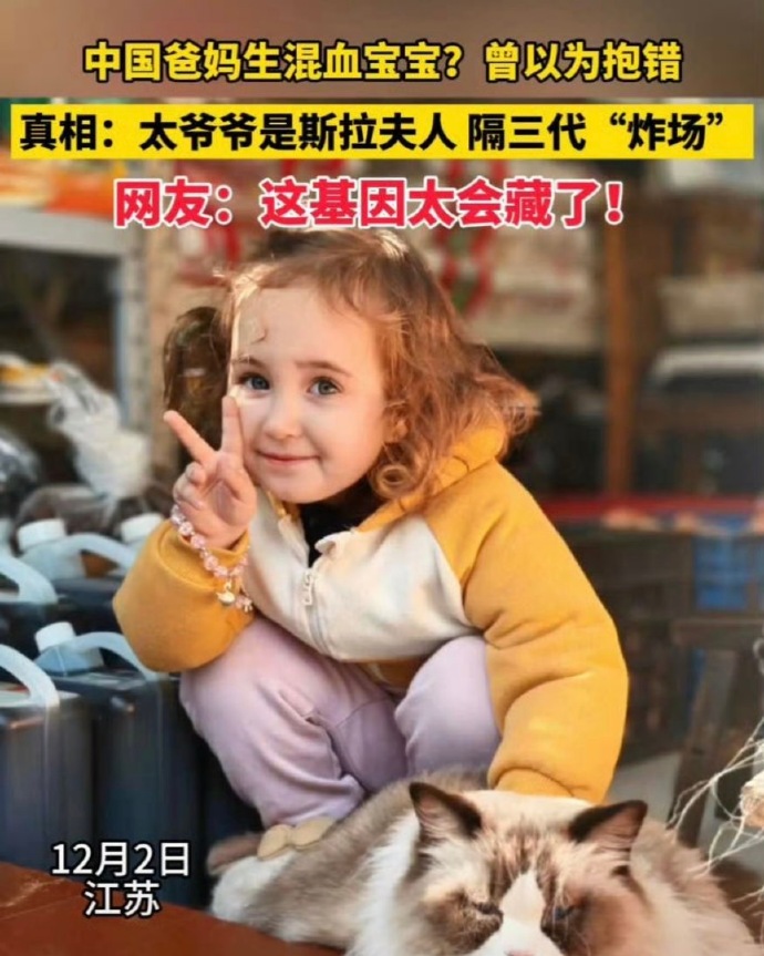 基因的力量有多强大?曾祖父的“金发碧眼”遗传基因竟过了近百年才在曾孙女的身上显现!近日,江苏一对中国夫妻生下金发碧眼的女儿,引发广泛关注。家人起初以为是“抱错孩子”,后通过亲子鉴定确认为亲生。