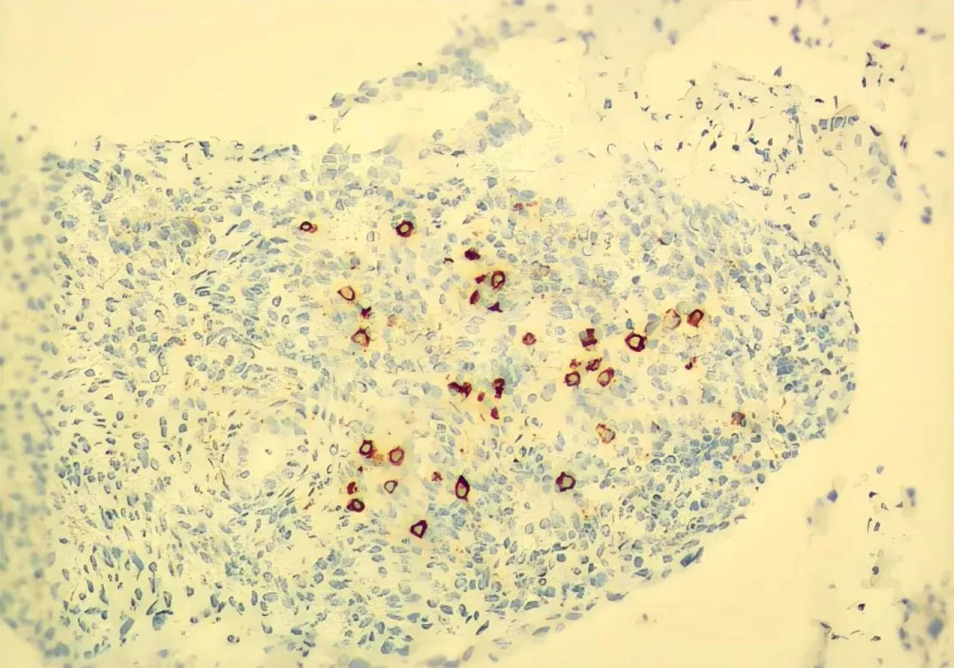 诊断慢性子宫内膜炎关键在于确认子宫内膜间质是否存在浆细胞浸润。为此,医生会对取下的组织进行免疫组化染色。通过使用不同的浆细胞标志物(如CD38、CD138、MUM-1等)进行染色,可以准确判读是否有浆细胞存在。在慢性子宫内膜炎的样本中,可以看到一个个标志物阳性的浆细胞。
